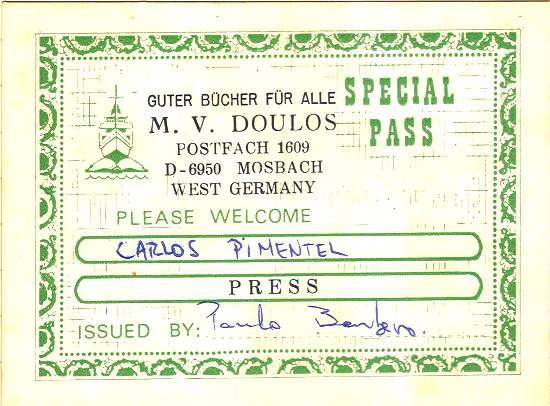 Imagem: credencial para acesso da imprensa a bordo do Doulos, em 1981