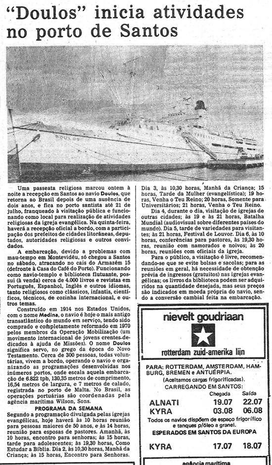 O editor de Novo Milênio, então responsável pelo caderno Marinha Mercante do jornal O Estado de São Paulo, registrou a chegada do navio a Santos, na página 31 da edição de 30 de junho de 1981: