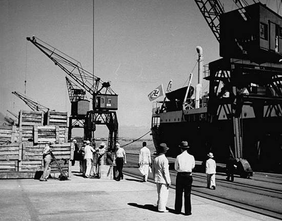 sabotagens e espionagem, e aprisionar os navios dessas bandeiras que aportassem em Santos. Assim, além de curiosa, é até rara esta foto de um navio hasteando a bandeira nazista