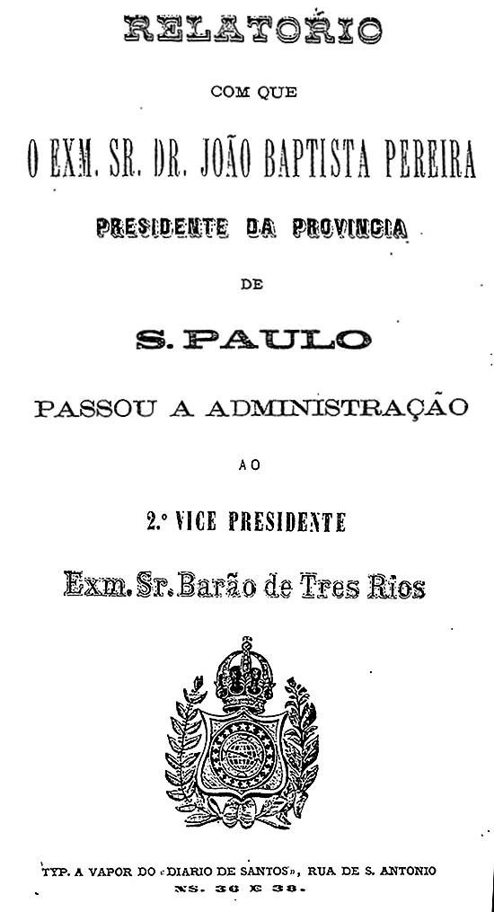 O assunto foi tratado nas páginas iniciais do relatório que Batista Pereira fez ao seu sucessor no governo provincial, Joaquim Egídio de Sousa Aranha, o barão de Três Rios. Esse relatório foi aliás impresso em Santos, na Tipografia a Vapor do Diário de Santos, e o tema é tratado nas páginas 5 e 6, 12 a 20 e nos anexos 3 e 4.
