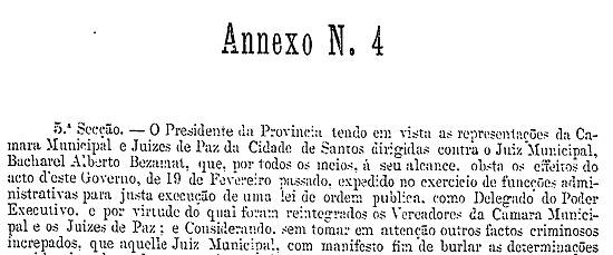 A Assembleia Legislativa Provincial enxertou no título das Disposições Permanentes da resolução que orçou a receita e fixou as despesas das Câmaras Municipais, dois artigos, nos quais, desconhecendo positivamente a existência legal da Câmara Municipal de Santos, composta dos vereadores mandados reintegrar, não só declarou nula a eleição de tais vereadores, como determinou que todos os contribuintes que pagassem impostos a essa Câmara não ficariam exonerados por isso, e antes obrigados a novo pagamento.