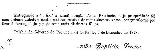 Palácio do Governo da Província de São Paulo, 19 de fevereiro de 1878. - João Baptista Pereira.