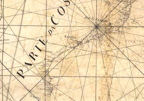 notando-se ainda as coordenadas a partir do Rio de Janeiro e detalhes da costa brasileira até a cidade catarinense de Laguna: