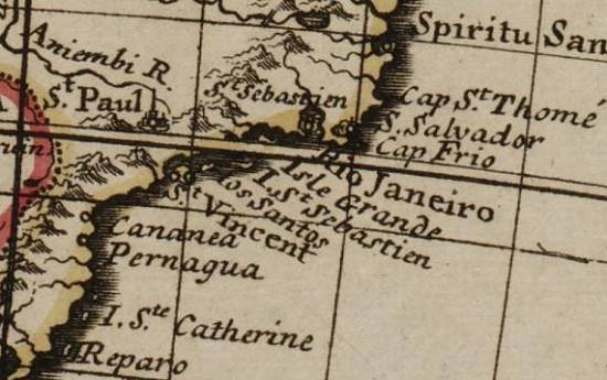 Santos e Capitania de São Vicente. Constam os topônimos Los Santos, St. Vincent e Sto. Amaro, e mais