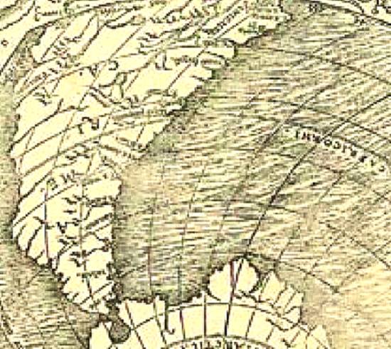 traços ambíguos que parecem ligá-la à extremidade oriental da Ásia. No lado atlântico, vê-se a Groenlândia como uma ilha distinta, enquanto um grande