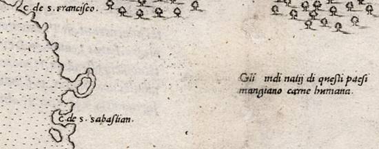 No detalhe, a baía de Santos, com a Ilha de São Vicente, logo acima do Cabo de São Sebastião. O texto em italiano informa que "os índios nativos destes países comem carne humana":