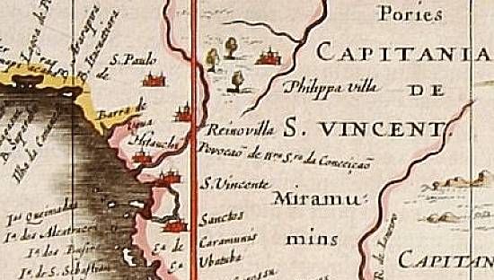 No detalhe, parte da então Capitania de São Vicente, entre as ilhas de Cananéia e São Sebastião, vendo-se as vilas de Santos, São Vicente e Itanhaém, além da vila de São Paulo deslocada para o Sul do Trópico de Capricórnio (aqui representado na vertical):
