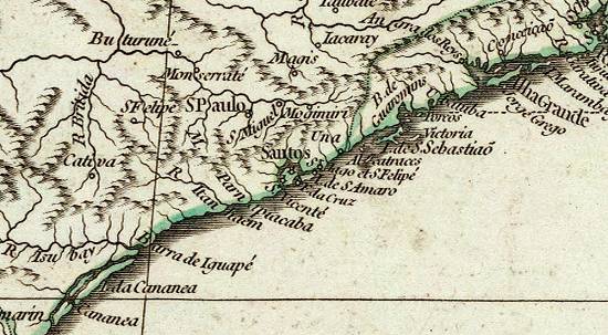 Paraíba do Sul, vendo-se ainda os limites do Paraguai bem próximos do litoral brasileiro: