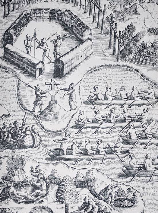 Tais equívocos se deram porque o belga, nascido em Liège, justamente produzia suas gravuras baseadas na interpretação particular que construía a partir das histórias recolhidas entre dezenas de aventureiros participantes das expedições ao Novo Mundo. Em duas oportunidades, Bry desenhou fatos ligados à Baixada Santista. A primeira delas revela uma batalha que teria ocorrido entre os colonos de Santos e São Vicente, contra índios contrários à presença portuguesa na região, provavelmente tupinambás da região norte.