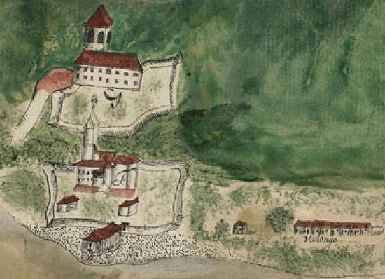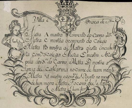 marcada com a letra J (o Forte da Vila ou de Mont Serrat), e (marcada com a letra B) a igreja matriz