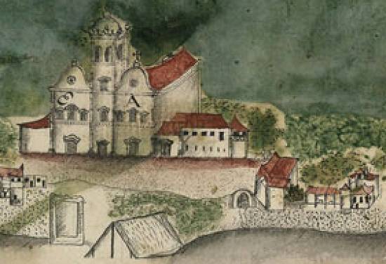 "q'está emcuberta com o colegio" (o Colégio dos Jesuítas). Marcado com a letra C, o convento desse Colégio: