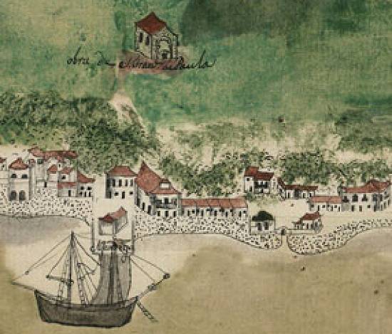 registrou em 1614), tendo na linha d'água a Alfândega (na direção da atual Rua Frei Gaspar, que por isso mesmo já teve o