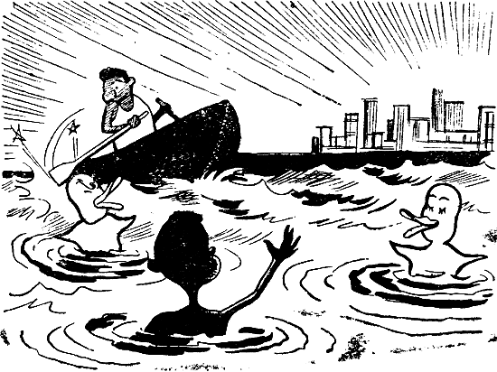 Quando Patolo, depois do longo mergulho, voltou à tona, coincidiu do bombeiro dar uma remada. Pronto. A pá do remo bateu na cabeça de Patolo. Este deu um gritinho. Por uns instantes ficou meio tonto. Mas foi rápido. E deu a bronca: "Será que vocês não enxergam?"