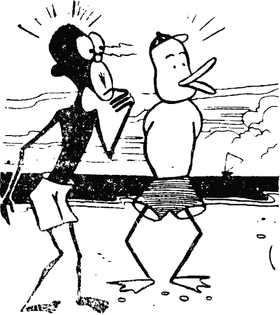 Jabuca riu, mostrando os alvos dentes. Nesta ocasião passavam algumas garotas bonitas. Jabuca e Patolo não perderam tempo. Viraram os olhos, acompanhando-as. Jabuca exclamou: "Puxa, que praia bonita, não, Patolo?"