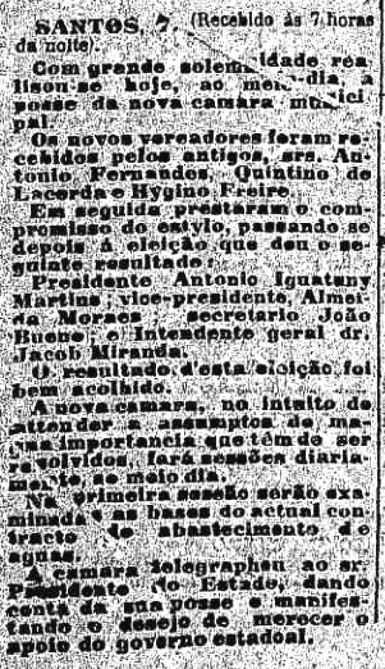 O dr. Jacob Thomás Itapura de Miranda foi nomeado para o Conselho Municipal de Intendência na legislatura que se instalou a 7 de janeiro de 1896, renunciando, porém, ao cargo por ter sido eleito intendente municipal, governando o Município até 7 de abril de 1898, quando foi substituído pelo coronel Narciso de Andrade. (N.E.: SIC: outras fontes apresentam cronologia diferente. Em 13 de abril de 1898 o intendente municipal era Antonio Iguatemy Martins, conforme citado em nota publicada no dia seguinte no jornal O Estado de São Paulo, página 1, col. 8. Outra nota desse jornal, publicada em 15 de abril, informava que no mesmo dia 13/4  Antonio José Malheiros Júnior enviou à Câmara um projeto de lei, na qualidade de intendente municipal, como consta no mesmo jornal em 15/4/1898, pág. 1 col. 2. Na edição de 30/4/1898, o mesmo jornal informa a substituição de Antonio José Malheiros Junior por Joaquim Montenegro.).