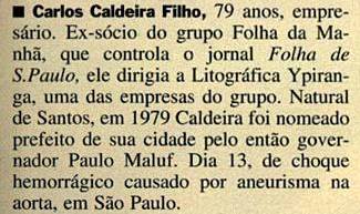 Caldeira prefeito - No dia 8 de fevereiro de 1979, o então governador eleito, Paulo Salim Maluf, apontava Carlos Caldeira Filho como futuro prefeito de Santos, em substituição a