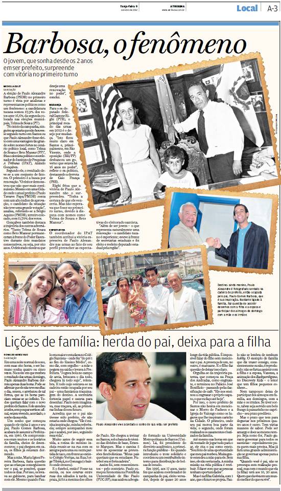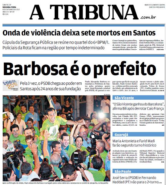 A vitória eleitoral do candidato a prefeito Paulo Alexandre Barbosa, pelo PSDB, foi noticiada assim pelo jornal santista A Tribuna, em sua edição de
