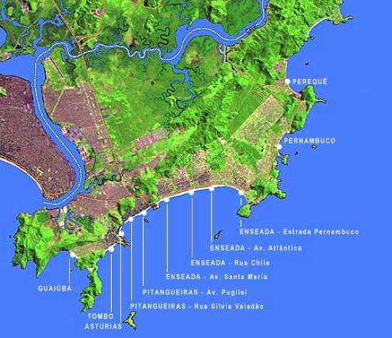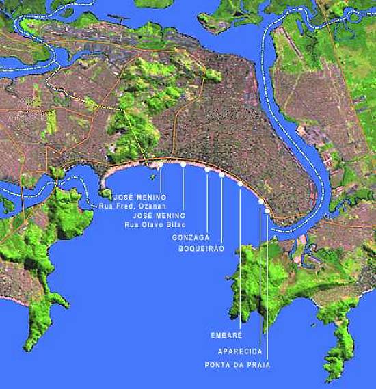 Ao lado, foto da Baixada Santista pelo satélite Landsat a 100 km de altura, tendo em verde o adensamento urbano e em branco as áreas de morros, matas e baixo povoamento. Abaixo, diversas fotos por satélite obtidas cerca do ano 2000, trabalhadas em computador, com colorido artificial e identificações de praias e principais vias de acesso e circulação (as linhas brancas pontilhadas indicam limites municipais). As áreas escuras indicam ocupação urbana e as verdes indicam morros, matas e áreas de baixa densidade populacional.