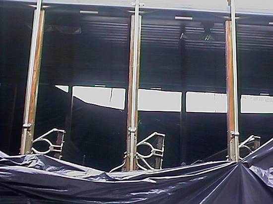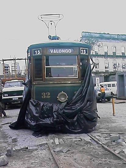 Com o prefixo 32, preparando-se para cumprir a nova linha 15, o bonde turístico de Santos entrava no dia 19/9/2000 (quando foram captadas estas imagens) na fase de testes finais de linha para a inauguração do circuito no sábado seguinte, dia 23/9. Uma proteção plástica foi utilizada para evitar danos pelo mau tempo reinante, já que ainda não está pronta a cobertura da garagem em que ficará, quando não estiver sendo utilizado, no pátio do bairro do Valongo, ao lado da antiga estação da Estrada de Ferro Santos-Jundiaí.