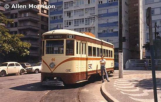Na foto de 1984, enviada a O Bonde pelo especialista norte-americano Allen Morrison, vê-se um bonde do tipo fechado (camarão), que foi mantido pela Prefeitura Municipal de Santos/Companhia Santista de Transportes Coletivos (CSTC) em uma pequena linha turística próxima à igreja basílica de Santo António do Embaré, na praia do mesmo nome, com prefixo 46 e número de linha 13.