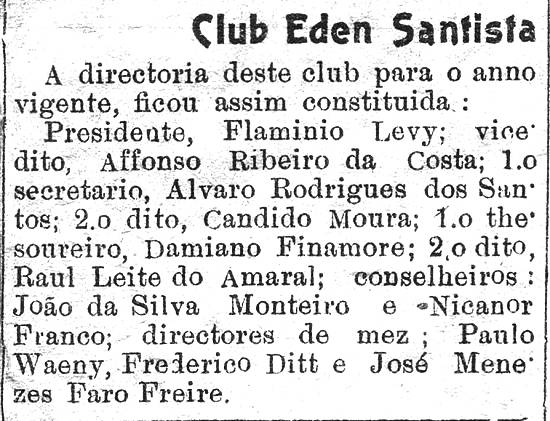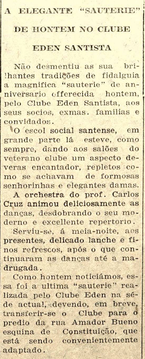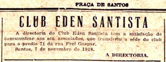 Direttoria do Clube Eden comunica o início das atividades na nova sede da Rua Frei Gaspar, 71 Jornal Praça de Santos, 8/11/1928, página 10
