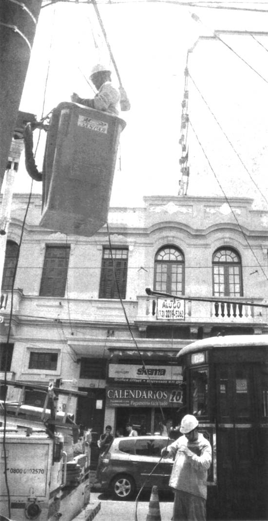 bonde passava em frente a um bar, no número 103 da via. Assustados, os passageiros desceram do veículo e se refugiaram na calçada, em meio a faíscas.