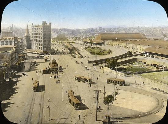 por óculo retro-iluminado, cerca de 1910 (data estimada pelas obras do Correio Central), com a Central Station à direita e a Railway Square