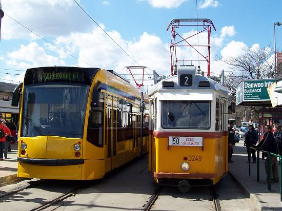 Siemens (à esquerda), que entrou em operações em Budapest em 2007, e o antigo bonde UV (à direita)