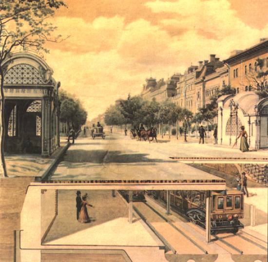 Andrássy), vendo-se uma interseção da rua com a linha 1 do Metrõ (Millenium Undergound Rail) abaixo do nível da rua