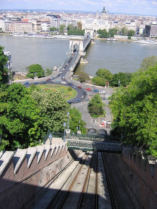 Funicular Castle Hill em foto de maio de 2005, vendo-se a ponte, a praça e o rio