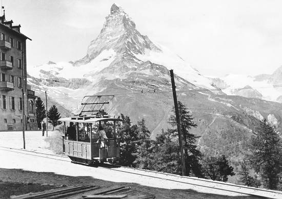 servindo ao transporte de hóspedes do hotel, suas bagagens e mercadorias, usando (da mesma forma que o trem de Gornergrat), corrente trifásica. A