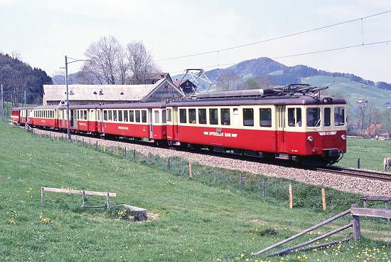 Quando uma linha de bondes serve a duas localidades, passa a ser considerada ferrovia, como no caso destes bondes-trens da linha de Appenzellerbahn, na Suíça.  A linha de 59,7 km com bitola métrica foi construída entre 1875 e 1912.