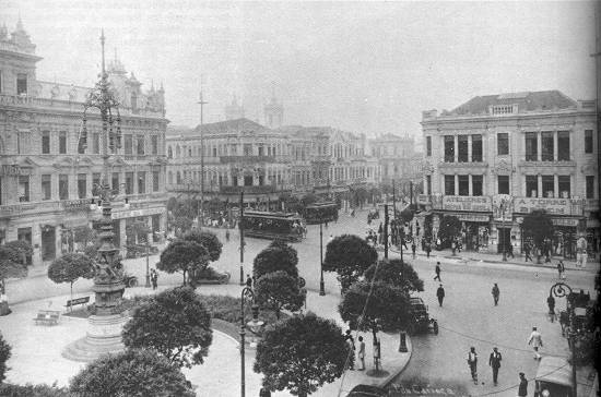 A segunda imagem retrata o Largo da Carioca, no centro do Rio de Janeiro, na segunda década do Século XX. E a terceira foto mostra o edifício dos Correios, na Rua 1º de Março, na década anterior.