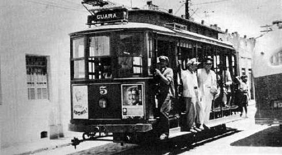 Na foto, o bonde aberto de prefixo 5 trafegando em Guaratinguetá em 1952. A primeira linha de bondes, ligando Guaratinguetá à cidade próxima de Aparecida do Norte (onde fica a Basílica de Nossa Senhora Aparecida, padroeira do Brasil) foi inaugurada em 1895. No Natal de 1898, a Ferro-Carril de Guaratinguetá inaugurou outra linha com tração animal, desde a Praça Rodrigues Alves, no centro da cidade, até Pedregulho, margeando o Rio Paraíba do Sul.