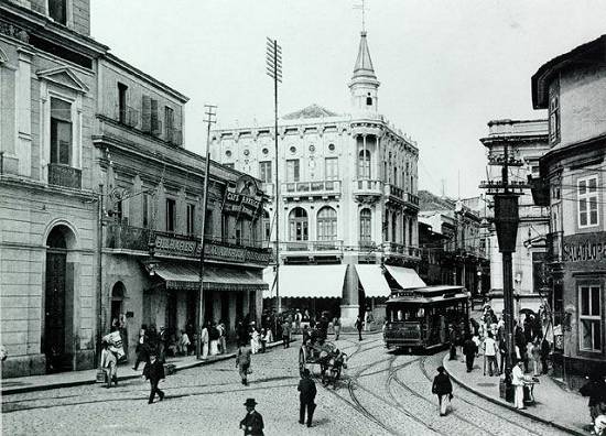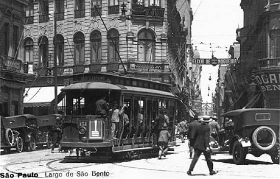 A foto acima mostra um bonde aberto trafegando pelo Largo do Tesouro, na capital paulista.