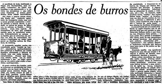 outro meio de transporte senão este que a nossa gravura representa: o bonde puxado a burros. Havia, é verdade, os carros de praça, os til