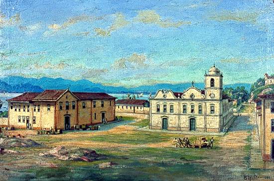 Intitulado Matriz de Santos e não datado, este óleo sobre tela de 45x70 cm pertence à Fundação