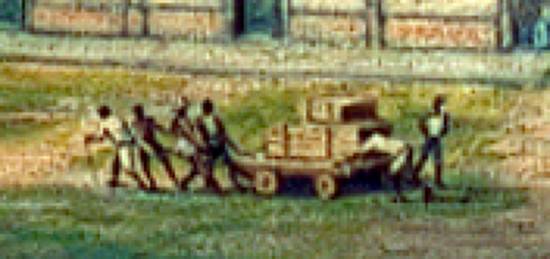 note-se pelos volumes transportados e o ângulo da cena que Calixto deve ter se inspirado na gravura de Debret que mostra tal cena na Rua Direita, junto