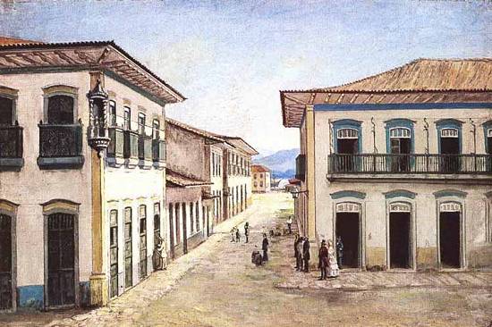 Outra versão desse quadro, notando-se alterações nas figuras humanas vistas na rua e junto ou dentro da edificação à direita, bem como alterações no calçamento (além da não inclusão dos barris), e mudanças significativas na altura, largura e quantidade de portas e janelas das casas retratadas. Com o título inadequado de Largo do Rosário em Santos (esse largo, embora próximo do local mostrado, não aparece no quadro), este óleo sobre tela de 40,8x60,9 cm, sem data, é mantido no Museu Paulista da Universidade de São Paulo: