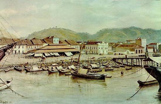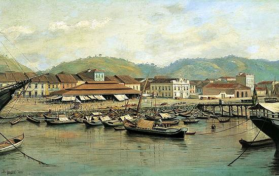 Banca de peixe e mercado das canoas, no Largo e Praia do Consulado, tendo ao lado a Capela do Carvalho ou de Jesus, Maria e José, em Santos. O lugar é identificado como Pátio ou Largo dos Gusmões (trecho da atual Rua Dr. Antonio Prado, defronte ao local em que seria construído algumas décadas depois o armazém 2 da Companhia Docas de Santos) e o mercado é o Provisório, inaugurado em 1880.