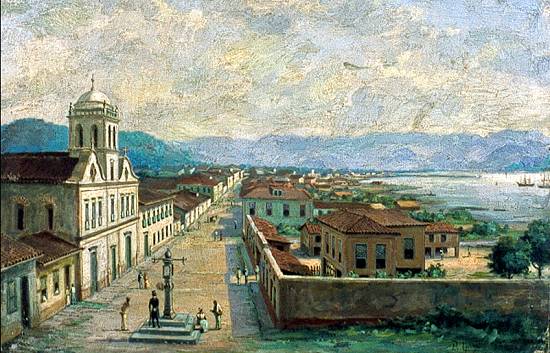 Igreja do Carmo, vista de perspectiva; o Pelourinho no primeiro plano, à direita o Arsenal de Marinha e o estuário. Ao fundo, a Rua Direita, hoje XV de Novembro, no Centro de Santos. A tela, não datada, com 45 x 70 cm, pertence ao acervo da Fundação Pinacoteca Benedito Calixto, de Santos: