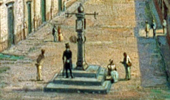 Neste detalhe do quadro acima, o pelourinho e as pessoas no seu entorno: