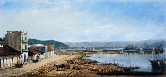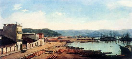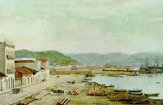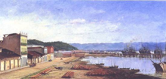 Porto do Consulado e seus trapiches, tendo ao fundo a Serra do Mar, em 1886 (seis anos antes do início das obras do porto organizado de Santos, nesse mesmo local). À esquerda, construções no bairro do Valongo (topônimo derivado da então Rua da Praia, que - por sua vasta extensão acompanhando a beira-mar - era chamada de "caminho que vai ao longo", ou, pelos genoveses donos dessa terra, "camino que va al longo").