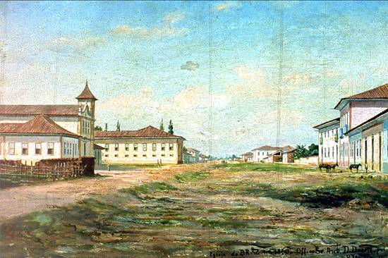 Igreja do Brás, em 1860. No canto inferior direito da tela, Calixto anotou "Igreja do Braz em 1860. Off. do sr. Arcb. D. Duarte. Por B. Calixto