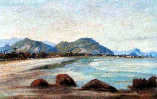 olhar para os lados de Santos e da Ilha Porchat, a praia do Gonzaguinha, em São Vicente, aparece (também) nestes quadros de Calixto.