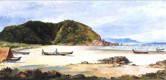 retratando aspectos de suas praias. Como esta, sem data, executada em óleo sobre tela, com 40 x 60 cm, pertencente ao acervo da Bolsa de Valores de São