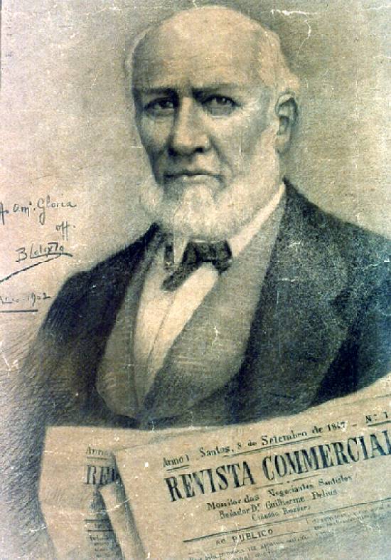 dedicatória "Ao amigo Glória", o retratado tem consigo o primeiro exemplar da Revista Commercial, datado de Santos, 8 de setembro de 1847 -