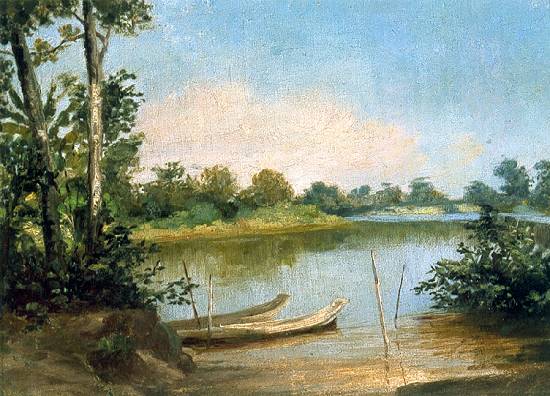 Sem data, Paisagem com Rio e Canoas é um óleo sobre tela de 24 x 32 cm, mantido numa coleção particular: