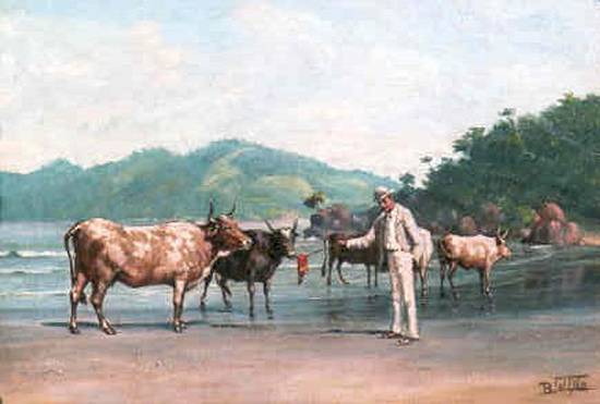 Este curioso tema Provocando o Gado, foi motivo de uma pintura não datada, em técnica de óleo sobre cartão,