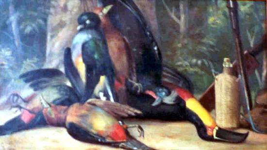 Pintado em 1927, este óleo sobre madeira mede 47,5 x 83,6 cm, sendo intitulado Caça: Lebre, Pomba e Marreco: